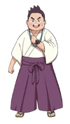 Bruno is a fair-skinned chubby boy with brown spiky hair and brown eyes. He wears a white kosode, a blackberry colored hakama, zori sandals and a necklace of green Buddhist prayer beads.