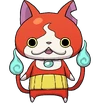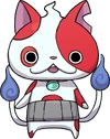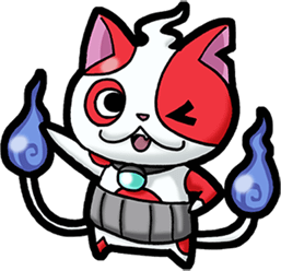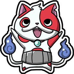 A white cat with red spots all over its body. Its inner-ear and nose are dull pinks. It has a gray Haramaki around its stomach and an aquamarine sphere attached to its collar. The flames on its tails are indigo. Since this Yo-kai is a fusion of Whisper and Jibanyan, they both fight over who controls the body.