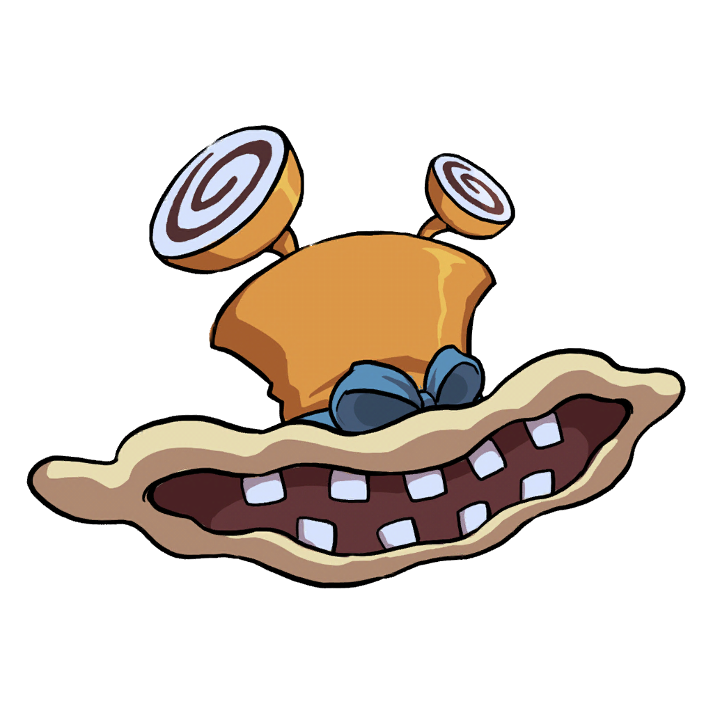 Dummkap has a similar appearance to Wazzat, looking like an orange hat. He has thick lips that form the brim with scattered square teeth. He has a blue bow/ribbon around him, somewhat like a nose. On top are two eye-stalks with swirled eyes.