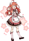 Itsuki (Valentine's) resembles Itsuki Nakano. She has a red-pink and brown maid dress. The top has a brown collar with a lighter brown edge and a brown tie with a light brown cross at the bottom. It has short puff sleeves with a brown striped hem. Her skirt is brown with a white frilly hem and there is a segmented red-pink skirt over the top of it. It has a brown and gold tip with the side panels having a lighter brown ruffled hem, a diamond pattern and red straps at the front. Her apron is white and lined with brown stripes down the straps and around the apron skirt. On her waist is a corseted section with red lace and a bow at the back. The skirt apron has a small red and light brown heart on one side. On her wrists are red cuffs with white ruffled edges. She has dark brown Mary Jane shoes with golden buckles and light pink knee high socks with a ruffled top edged with a red ribbon tied at the side. In her hair are two thick light pink ribbons with white lacy edges and two yellow star hair clips on either side of her fringe. She has a white chocolate star in one hand.