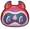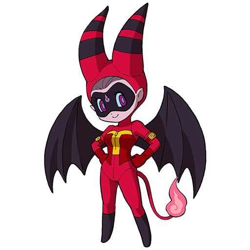 Little Charrmer's suit highly resembles a devil. She has two black and red striped horns on her head, black wings on her back, a red tail with a pink wisp on the end, black boots and red attire with gold accents. On her face, she has a black mask covering most of her face except for her purple and orchid colored eyes with two light blue sclera.