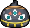 He wears a black bell-like headdress, with is decorated with gold, and has a wisp-like tip. His wrists and ankles are clad in golden bracelets, and two of his arms are wielding spears.