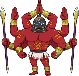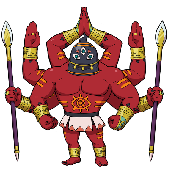 Majin Banbarayar is a large, humanoid Yo-kai with dark red skin and 8 arms.