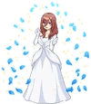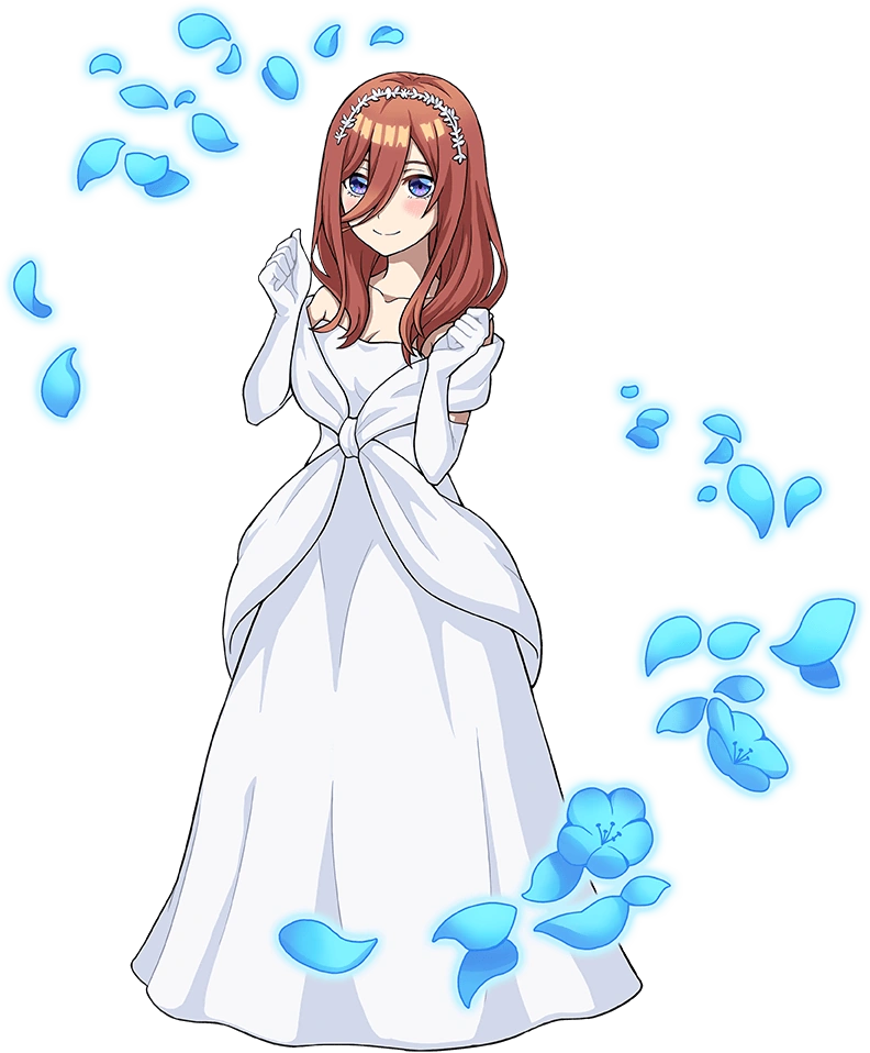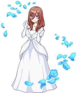 Miku (Wedding) resembles Miku Nakano. She has a white sleeveless wedding dress with a statement bow on her front with its trails wrapping around her shoulders and skirt. She has long white opera gloves and a silver headband.