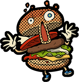 Oh Bah Gah! is, as his name implies, an anthropomorphic burger made of meat, cheese, tomato, lettuce, some hidden pickles, mayonnaise and ketchup. He has thin arms with gloved hands, and equally thin legs wearing sneakers. He has two eyes - the left one bigger than the right one,- and a very long mouth.