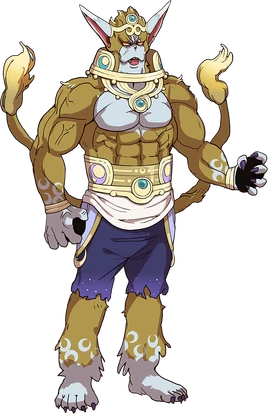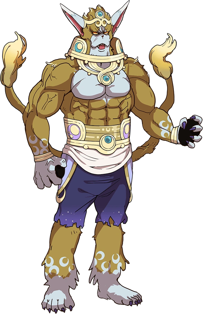 Oumadan Red J is a towering and very powerful anthropomorphic Cat Yo-kai, he has a pair of long pointy ears, a long face with a small beard under the chin, thick upper cat lips and angry-looking yellow eyes. Instead of wearing a belt equipped with numerous sticks of dynamite he wears a white sash with moon ornaments. He also wears a huge collar. All his fur is dull gold colored and has some crescent moon patterns.