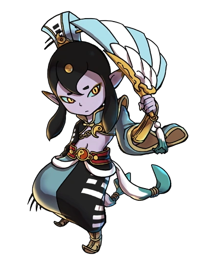 Soruka resembles his older twin brother greatly, but also contrasts him with a neutral face, black hair instead of red, a orange belt, a blue and black outfit whose patterns are reversed in placement compared to Noruka's, the yin-yang fragment emblem on his hat is facing the opposite way, his elongated nails are on his right hand to mirror Noruka's, and carries a blue and white feather fan in his left. His skin is light purple and has pointed ears. He and Noruka both wear an outfit resembling that of a Chinese general's.