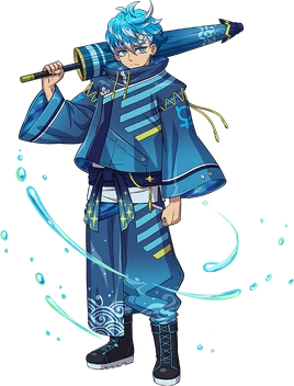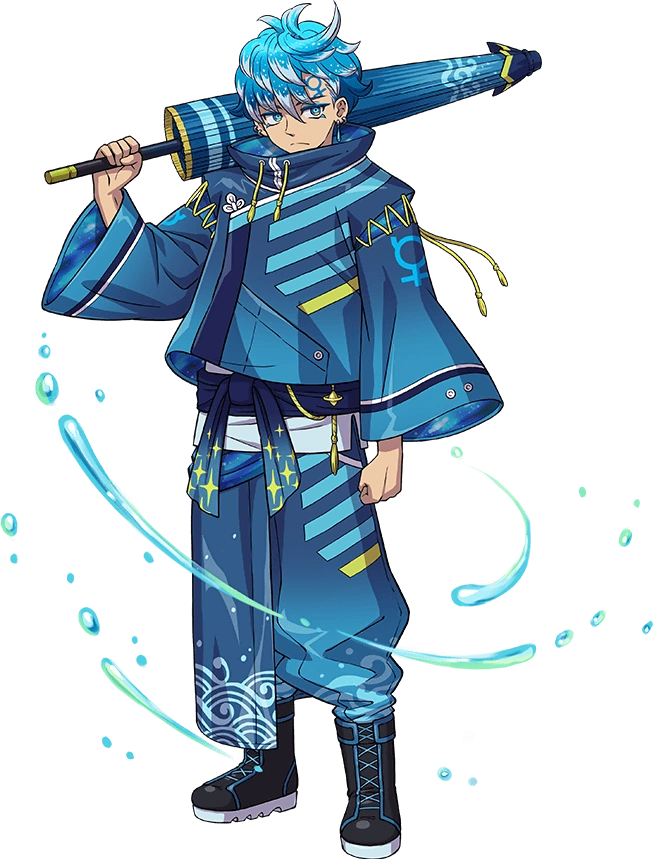Suisei no Asu wears a dark blue jacket with light blue and yellow stripes along with Mercurian symbols, it wears dark blue pants that have a water pattern, tied by a dark blue ribbon that connects to a white shirt. It wields a blue umbrella that has patterns matching that of its pants. Its hair is light blue with white tips, resembling a wave.