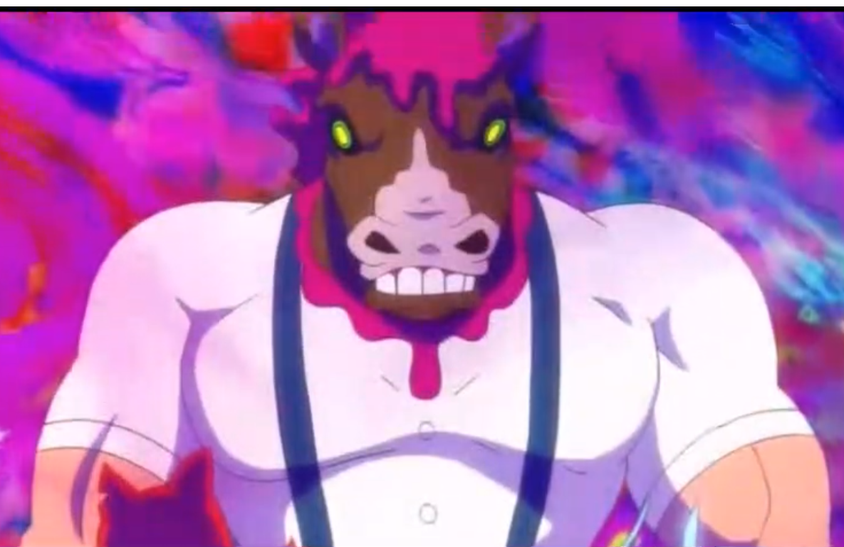 In his Lightside form, Umataro is a humanoid horse with pink goo-like hair. He wears a white button-up t-shirt along with blue shorts and blue suspenders.
